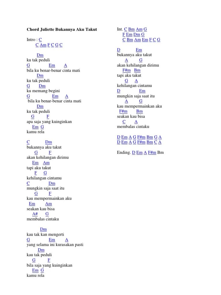 C dm bukannya aku takut g f akan kehilangan dirimu em am tapi aku takut . E kamu rela a bm bukannya aku takut e d akan kehilangan dirimu c#m f#m tapi aku takut . Bm em tapi aku takut. Tapi aku takut kehilangan cintamu. Bukannya aku takut ♫ guitar chords ♫ by juliette: